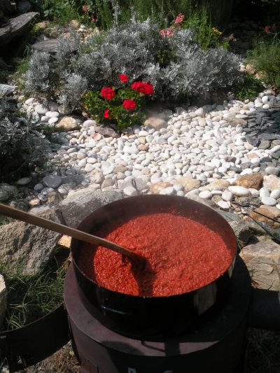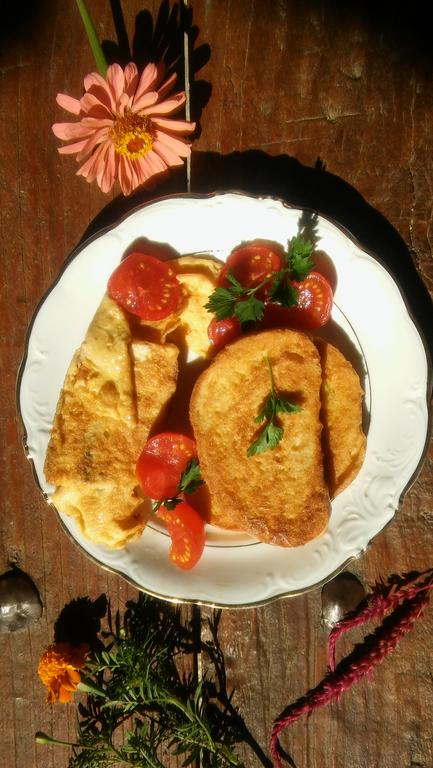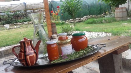 Семејниот се надополнува со домашно подготвената храна, а доматите од стари семиња, кои растат во дворот гостите можат самите да си ги одберат, за да им се подготват појадок или за вечера. Во бавчата имаат и салата, рукола, блитва…., а од локалните производители купуваат јајца.