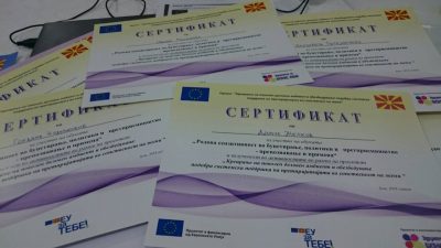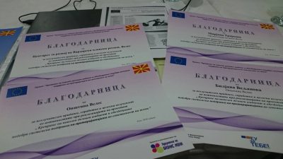 На завршните настани, во сите пет општини – Кичево, Ѓорче Петров – Скопје, Велес, Куманово и Битола, на задоволство на присутните учесници, имаше и церемонијален дел на доделување на Благодарници за сите кои придонесоа кон успешна реализација на проектните активности, како и Сертификати за посетената обука за родово буџетирање одржана во април, 2018, во рамки на проектот.
