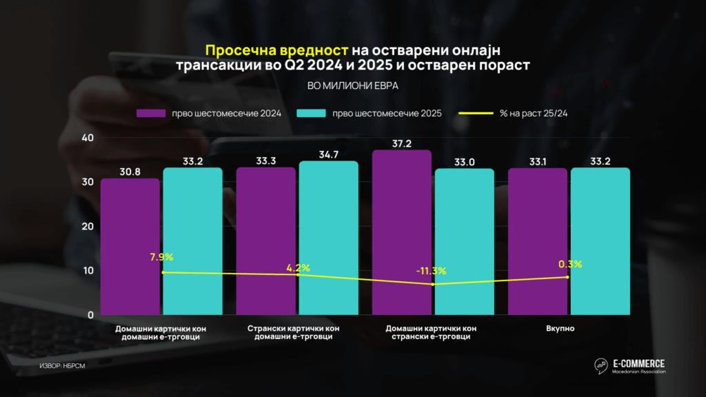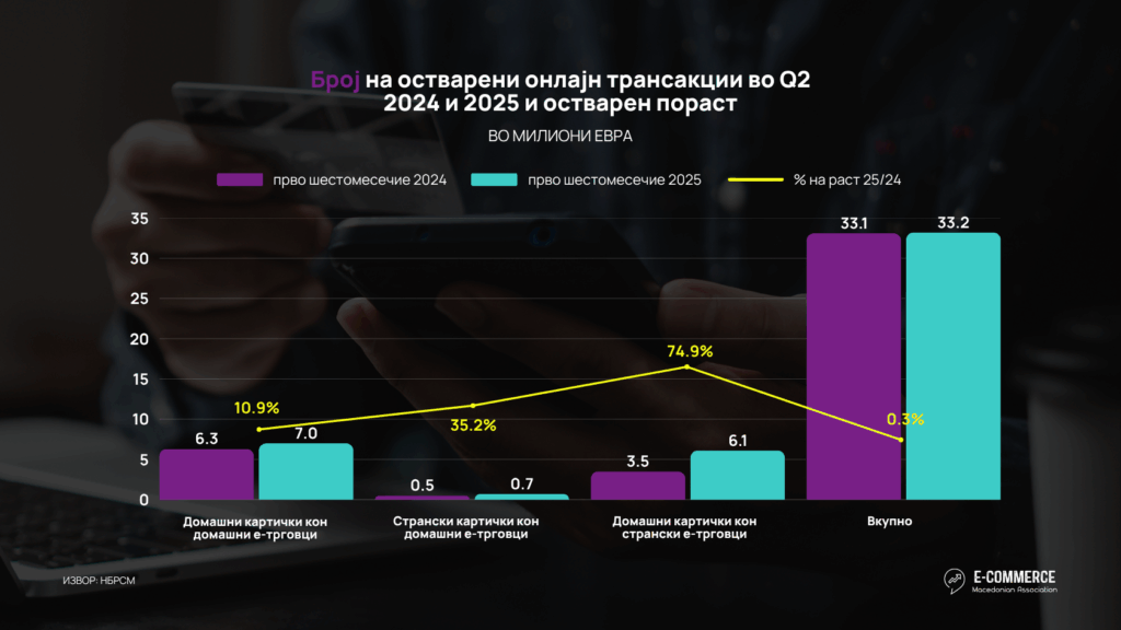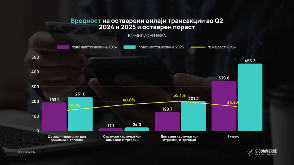 Асоцијацијата за е-трговија ги анализираше најновите објавени податоци за трансакции на места на продажба за е-трговија на Народната банка на Република Северна Македонија, согласно кои може да се забележи дека во првата половина од 2025 година вредноста на вкупните трансакции направени кон е-продажни места од Македонци дома и во странство, како и од иматели на странски картички изнесува 28,060.7 милиони денари или 456.3 милиони евра, што преставува пораст од 34.3% во однос на истиот период минатата година.