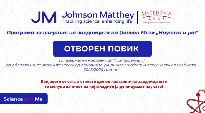 Македонија2025, во рамки на Џонсон Мети Програмата за поддршка на заедницата„Науката и Јас“, го објавува новиот повик за предметни наставници по природни науки (природни науки, биологија, хемија, физика) од основните училишта во земјата.