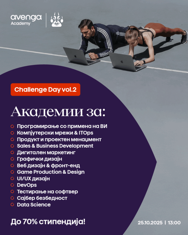 Avenga Academy (поранешен Сивус Едукативен и Развоен Центар) го организира второто издание на традиционалниот ден за тестирање за стипендии – „Challenge Day“, кој ќе сеодржи на 25.10.2025 (сабота) од 13:00 часот во соработка со Kinetics Fitness Studio, обединувајќи го знаењето, физичката активност и грижата за себе на еден динамичен и инспиративен настан.