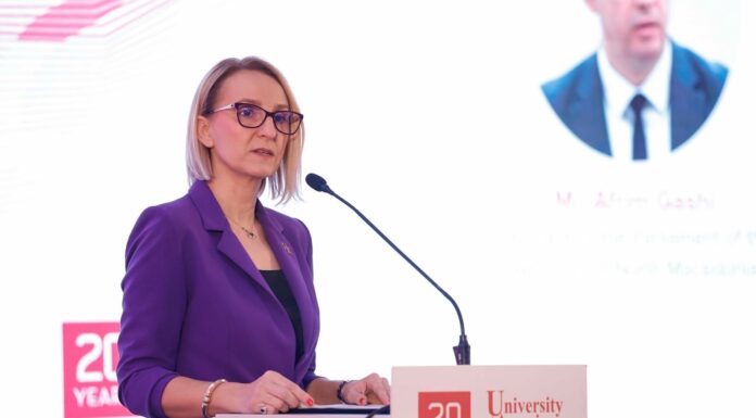 Свое свечено обраќање имаше и Претседателот на Собранието на Република Северна Македонија, г. Африм Гаши, кој ја истакна значајната улога на високото образование во националниот развој, општествената кохезија и подготовката на младите за современите глобални предизвици: „Високото образование е најважниот капитал на едно општество и држава, бидејќи сите области од јавниот живот зависат од неговиот квалитет. Образованието на утрешнината нè соочува со нови предизвици на дигитализација, но и креативност, како и соработка што бара и очекува одговорно лидерство. Универзитетите на нашето време мора да подготват граѓани способни да ги водат промените, а не само да ги следат. Во оваа мисија, академската заедница е фундаментален фактор за економски развој, иновации и европска интеграција. Универзитетот е срцето што го храни знаењето во телото на општеството – каде што се раѓаат идеи што го овозможуваат заедничкиот напредок.”, истакна претседателот на Собранието Гаши.