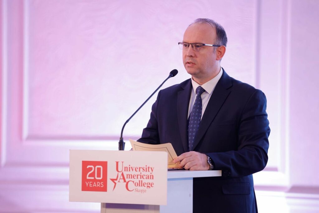 Осврнувајќи се на достигнувањата на УАКС како лидер во високото образование во земјата, претседателот на Собранието Гаши посочи: „Изминатите две децении, Универзитетот Американ Колеџ Скопје беше пионер во усвојувањето и употребата на меѓународните стандарди за квалитет во високото образование, градејќи добри образовни мостови помеѓу американскиот и европскиот пристап кон образованието. Ова овозможи напредна филозофија на учење што не се заснова на квантитет, туку на квалитет, на критичко размислување, креативност и интегритет. УАКС останува пример за визија, партнерство и вредности што треба да се негуваат и во следните 20 години.” – потенцираше претседателот на Собранието Гаши.