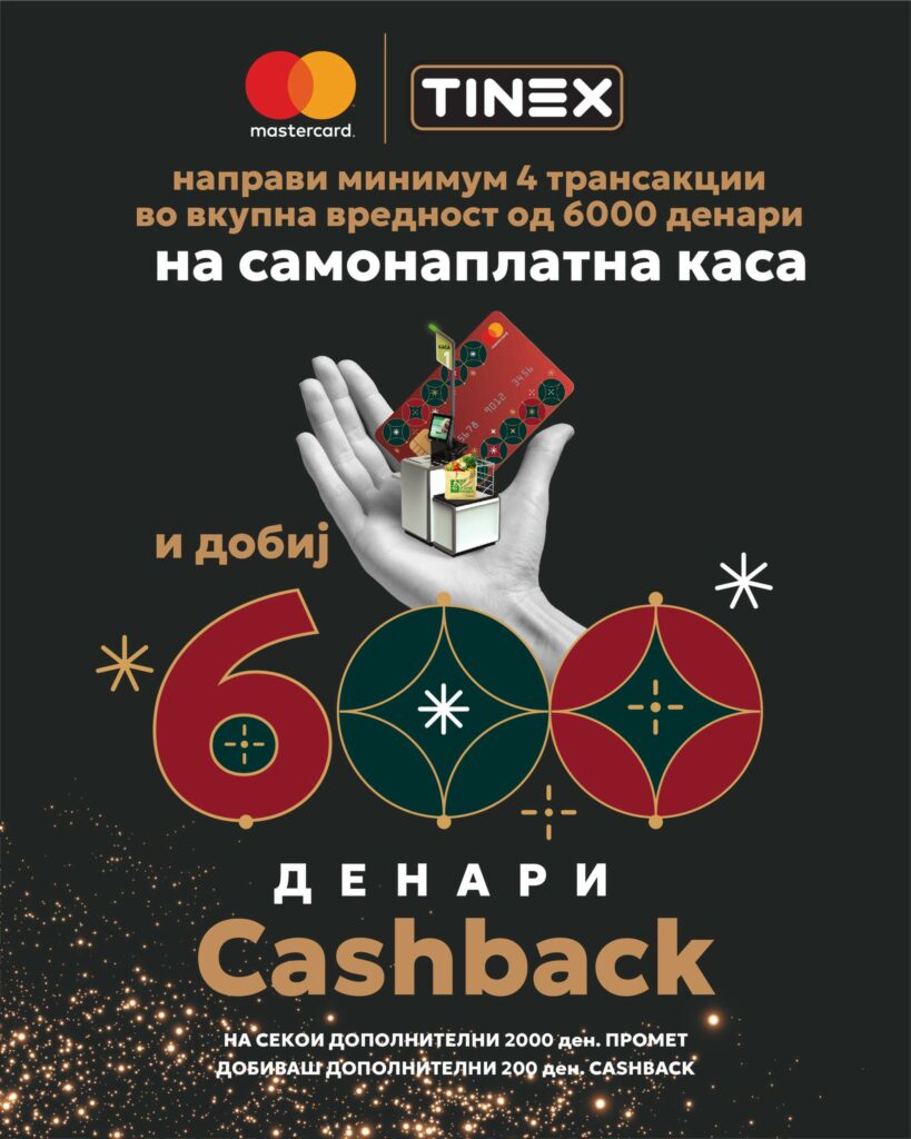 Со секое плаќање со Mastercard дебитна или кредитна картичка на касите за самонаплата во одбраните Тинекс и Конто маркети, ќе имате можност да остварите cashback и да ја наполните вашата кошничка со сè што е потребно за празничната трпеза и подароците.