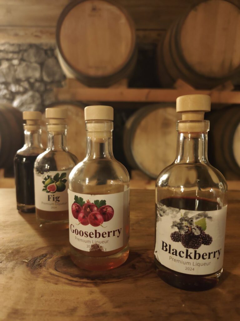 Во дестилеријата произведуваме лозова ракија, која одлежува 4 години во дабови буриња и се подготвува од висококвалитетно бело вино, црешова ракија, карактеристична за охридскиот крај, јаболкова, ракија од дуња, како и ликери од аронија, малина, огрозд, смоква, капина и ликер од дива оскоруша, единствен на нашиот пазар, кој е и наградуван на специјализирани меѓународни натпревари за дестилати. Може да се набават од куќен праг или со онлајн нарачка.