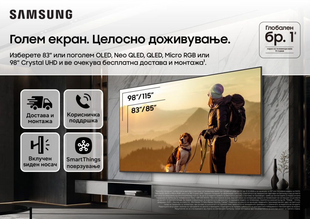 Токму затоа, Samsung мисли на своите корисници и има одлична понуда за нив. За визионерите кои избираат екрани со дијагонала од 83 инчи и поголеми, Samsung нуди бесплатна достава, професионална инсталација и вклучен соодветен ѕиден носач. Со оваа услуга имате гаранција дека вашиот нов технолошки центар ќе биде поставен со прецизноста што ја заслужува, овозможувајќи ви веднаш да се препуштите на уживање во совршенството на сликата.