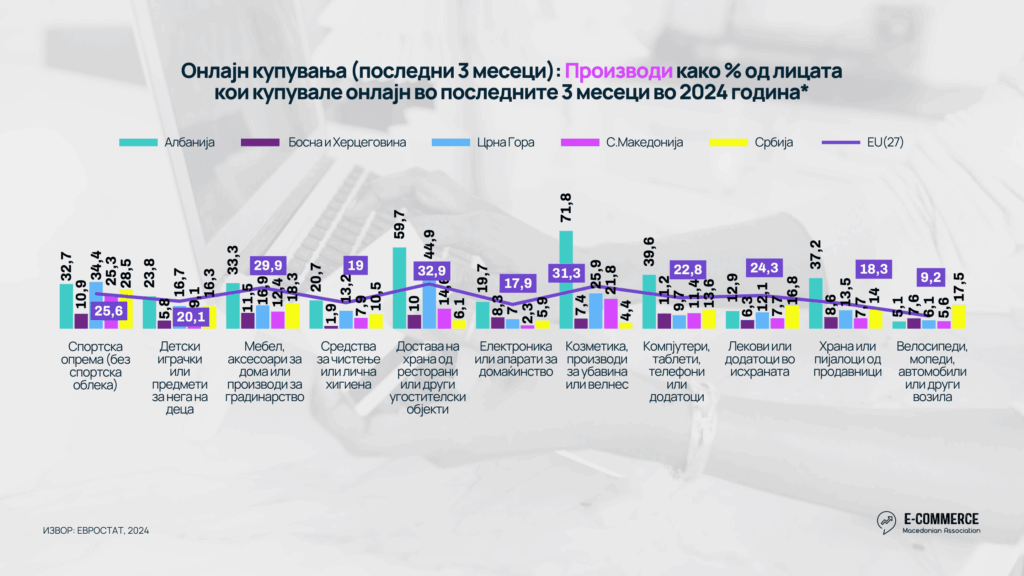Во Прегледот на Е-трговијата во Западен Балкан, 2025 година изработен од Асоцијацијата за е-трговија, анализирани се податоците од Евростат, 2024, кои покажуваат дека 63,2% од македонските интернет корисниците купуваат онлајн, што ја позиционира земјата подобро од другите балкански соседи освен Србија (65%), но сепак под европскиот просек од 76.6%. Но онлајн купувањето е концентрирано во ограничен број категории, со јасно изразени преференции. 73.9% од македонските онлајн купувачи правеле нарачки за облека, обувки и модни додатоци, што ја прави модата убедливо најдоминантната категорија со што Македонија е над европскиот просек.