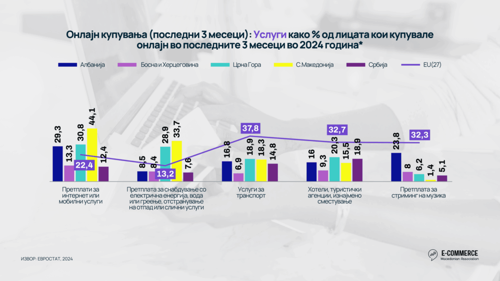 Во делот на услугите, 44,1% од онлајн купувачите платиле интернет или мобилни услуги онлајн, скоро двојно повеќе од европскиот просек од 22.4%. Исто така 33,7% платиле комунални услуги, исто така надминувајќи го европскиот просек од 13.2%. 18.3% од интернет купувачите направиле букирање за транспорт, а 15.5% за хотели, додека платените дигитални содржини остануваат слабо застапени, со само 1,4% претплати за музички стриминг.