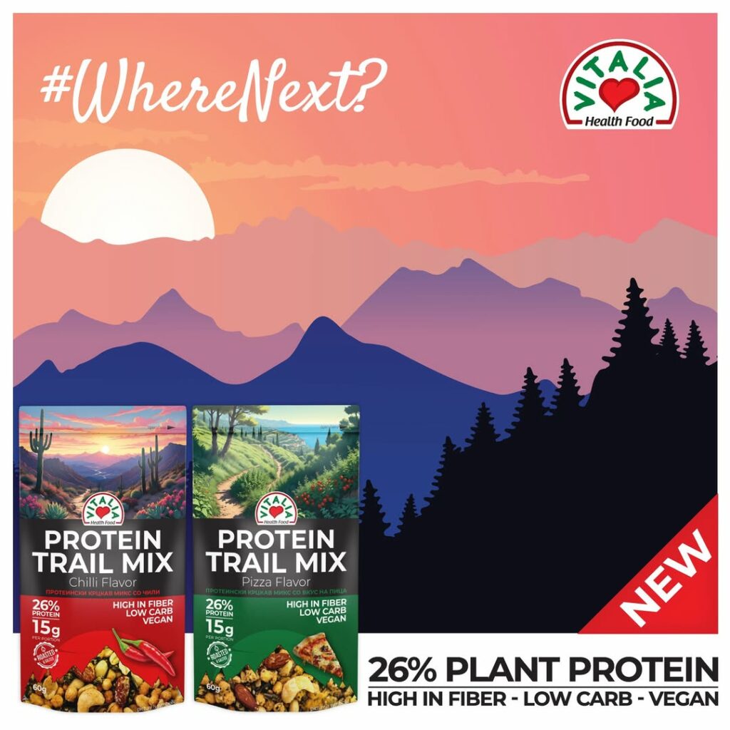 Понекогаш, едноставно посакувате да имате при рака грицки за секоја пригода – за удобна вечер гледајќи филм стуткани под ќебе, за прошетка низ градските улици или во најблискиот парк, но и за мигови кога во домот ќе дојдат ненајавени гости. За да ги задоволи дури и најделикатните потреби на потрошувачите, Виталиа го создаде Протеинскиот крцкав микс, кој е целосно вегански производ што содржи збогатено количество на протеин – дури 15g по пакување. Протеинскиот крцкав микс доаѓа во два различни вкуса: вкус на пица со неодолива и богата арома, како и вкус на чили кој е направен за љубителите на пикантна храна. Кој и да го изберете, нема да погрешите.