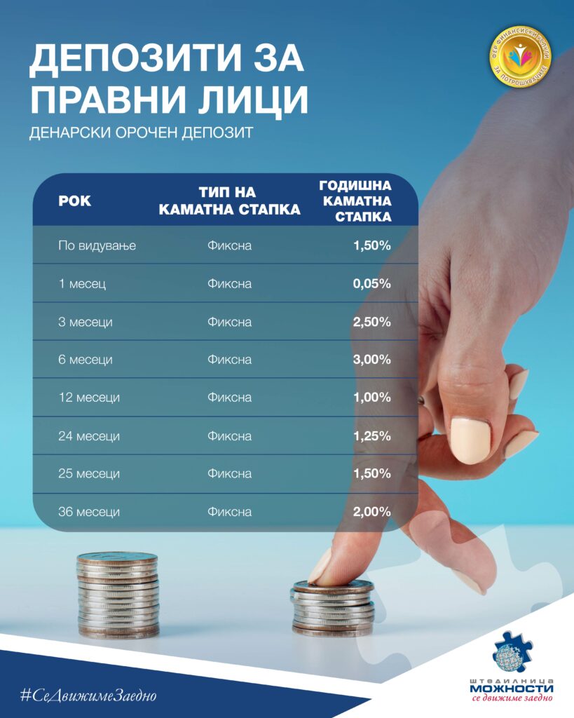 Воведувањето на депозитни продукти за компаниите претставува природен чекор во развојот на Штедилницата за да им понудиме на компаниите едноставни, сигурни и достапни финансиски решенија за управување на нивната ликвидност и остварување финансиски приходи. Штедењето отсекогаш било една од темелните активности на Штедилницата. Со постојано унапредување на условите кај штедните продукти за физички лица сакаме дополнително да им понудиме и на компаниите сигурни начини да ги планираат и зголемуваат своите ликвидни средства.