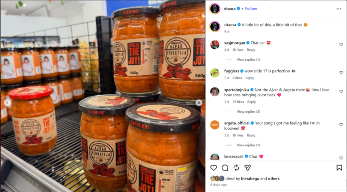 Дека македонскиот ајвар не познава граници, потврди и светската музичка ѕвезда Рита Ора! Пејачката, која веќе неколку години живее во Австралија, пријатно ги изненади своите следбеници од Балканот со една фотографија од нејзината последна објава на својот Инстаграм профил за време на нејзината посета на Нов Зеланд. „Малку од ова, малку од она“, напиша Ора и објави фотографија од полица преполна со тегли од познатиот бренд „Перустија“, сопственост на штипската фабрика „Ларс“. Со краткиот и симпатичен опис „A little bit of this, a little bit of that таа јасно стави до знаење дека овој деликатес е дел од нејзиниот избор при пазарување. Штипскиот ајвар го освои австралискиот континент Ова не е само обична фан-фотографија, туку доказ за успешниот извоз на македонските компании.
